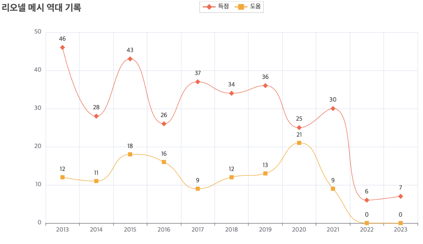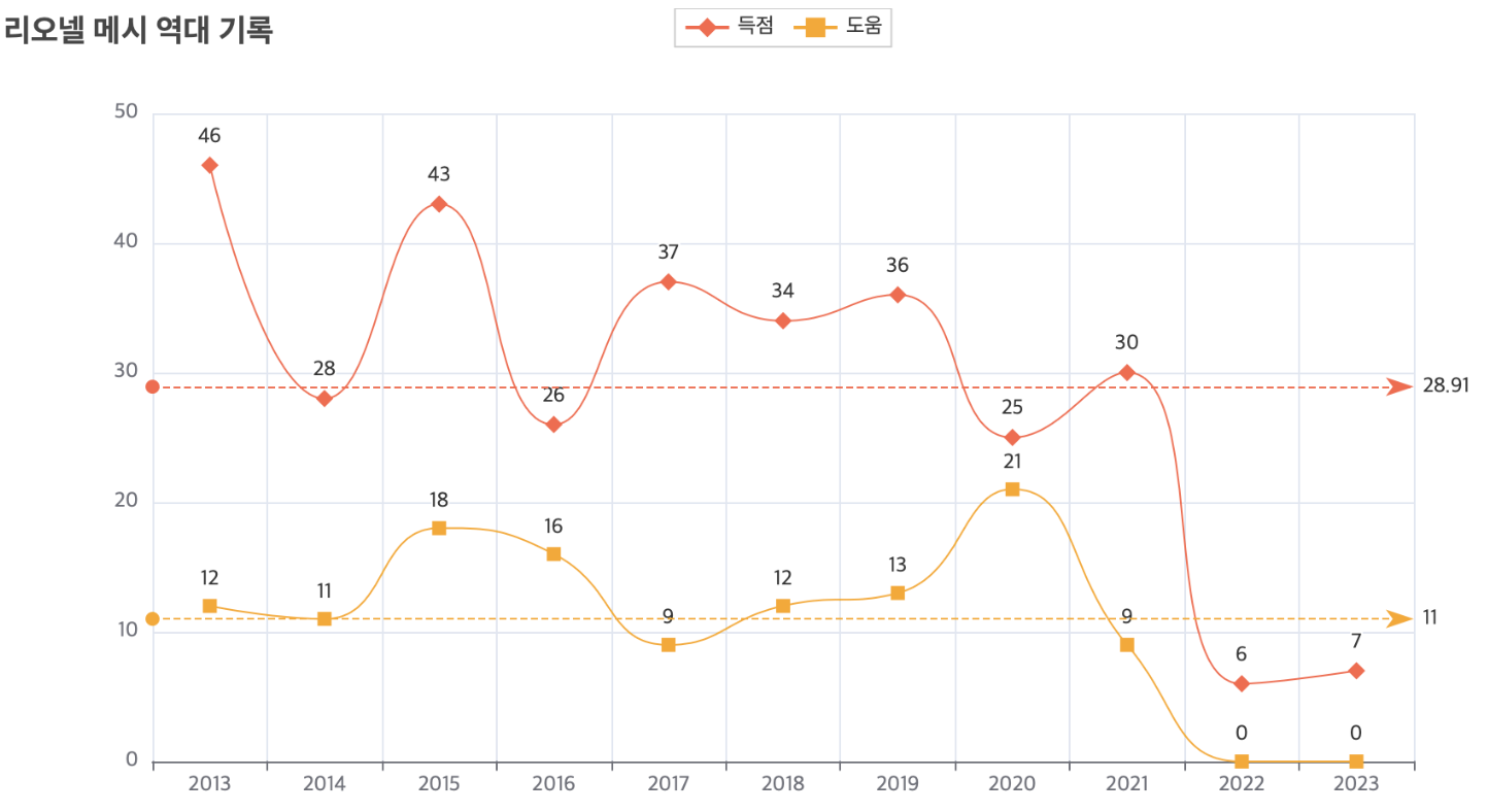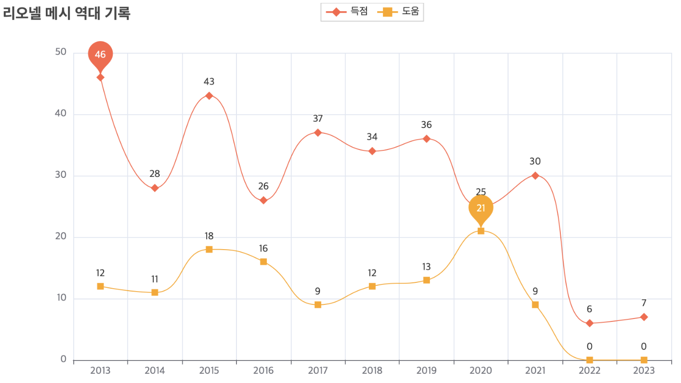 messi = pd.DataFrame({"์ฐ๋": years, "๊ณจ": goals, "๋์": assists, "๊ฒฝ๊ธฐ": games})